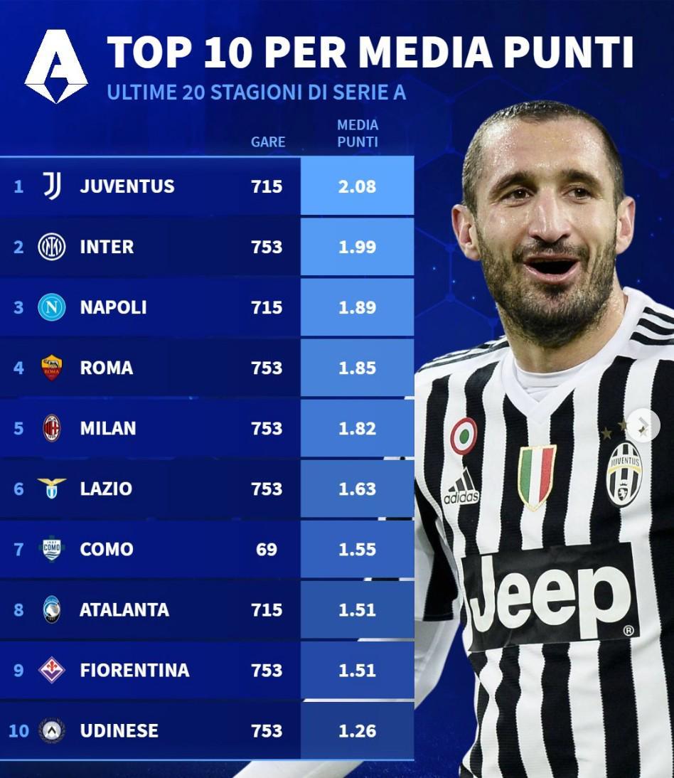 意甲近20年场均积分TOP10: